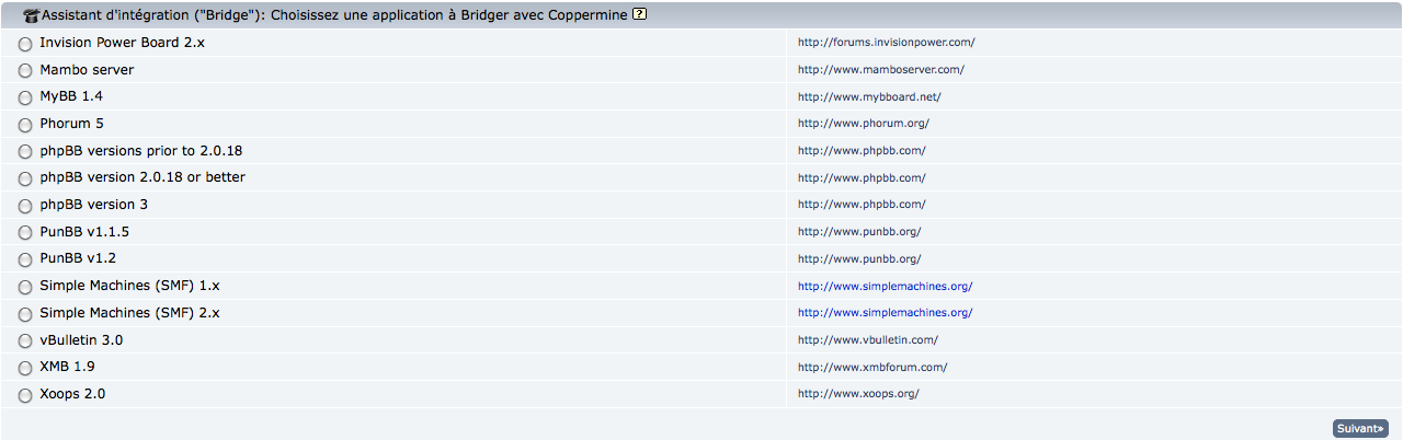 Dans la première étape de l'assistant "choisissez l'application avec laquelle vous voulez établir une passerelle avec Coppermine", vous devez choisir l'application que vous voulez avec Coppermine. Notez que vous devez avoir cette application installée sur votre serveur, elle doit être correctement configurée et doit être opérationnelle. N'utilisez pas le gestionnaire d'intégration si vous avez juste planifié l'intégration de Coppermine avec une autre application plus tard.